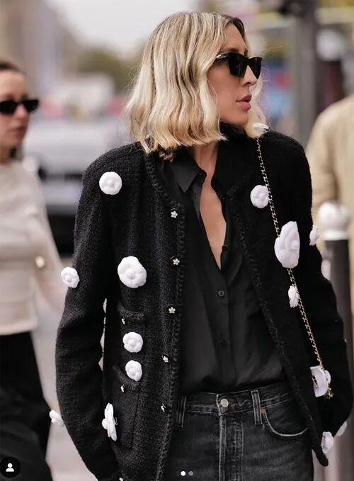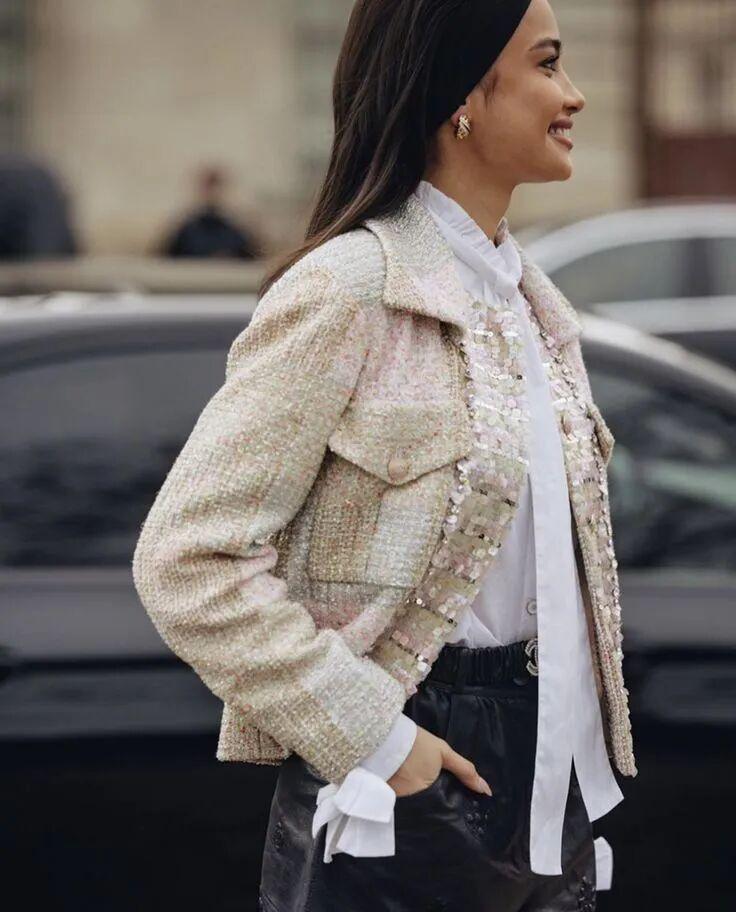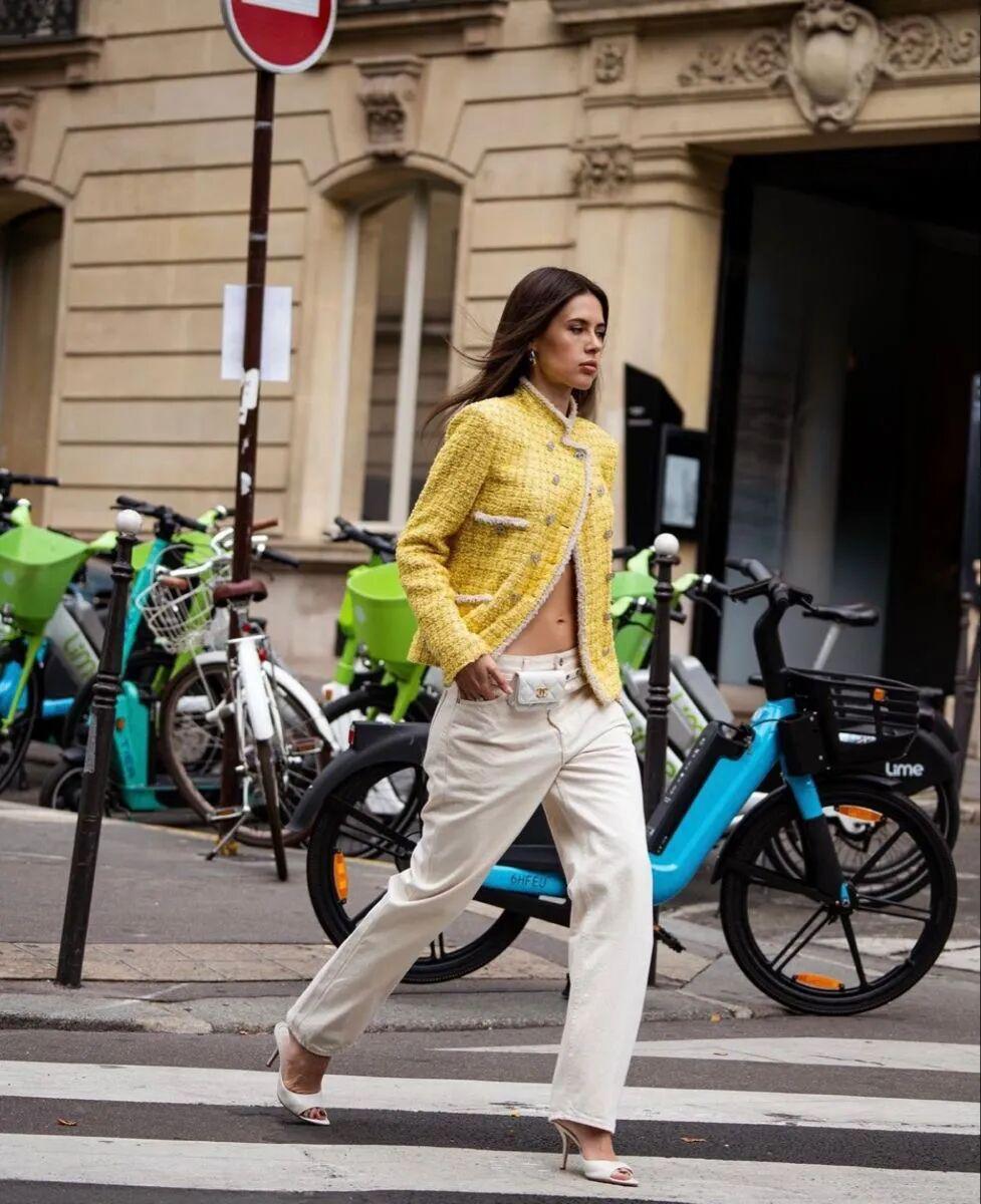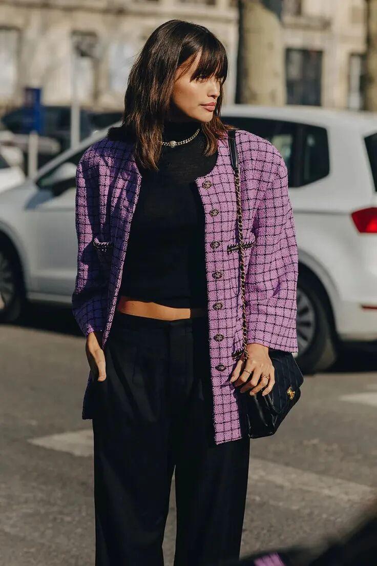 此时的小香风外套,可以选择带有轻微肩线结构的短款,勾勒上半身的轮廓,让比例更显平衡。