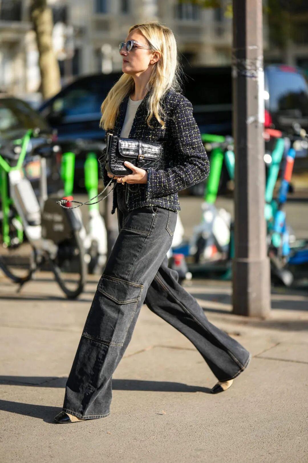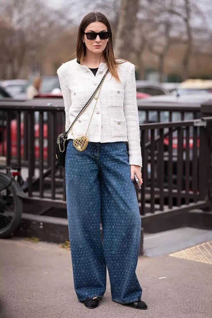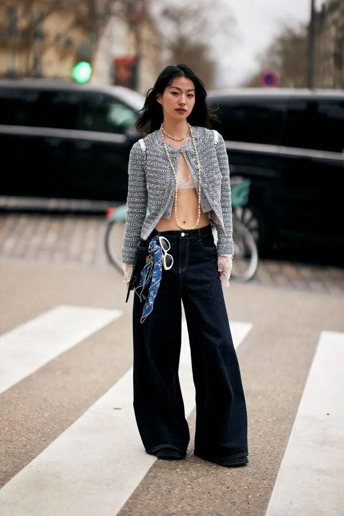 小香风与牛仔阔腿裤的搭配,一方面,上半身的细腻与下半身的随性共同构成了一种松弛有度的美感。