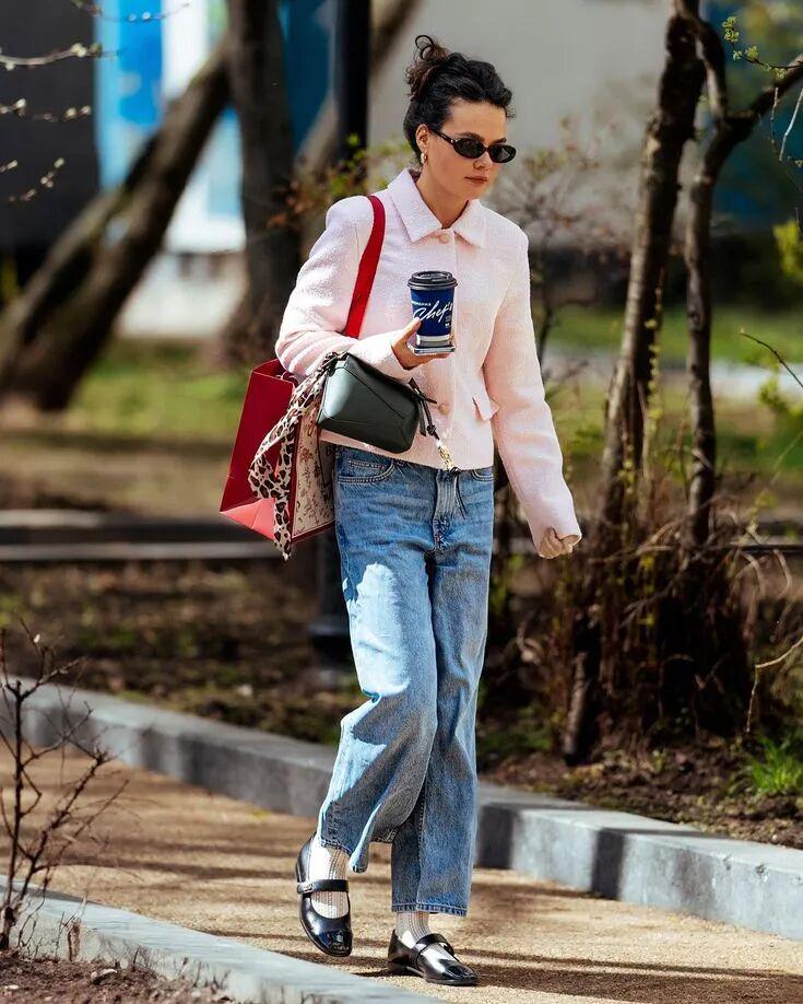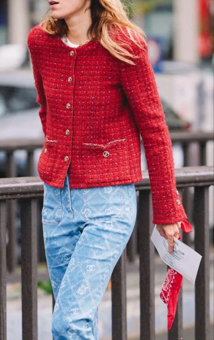 最后,材质和色彩上无需复杂堆叠,简单的纯色小香风外套与浅蓝牛仔裤已足够有层次。