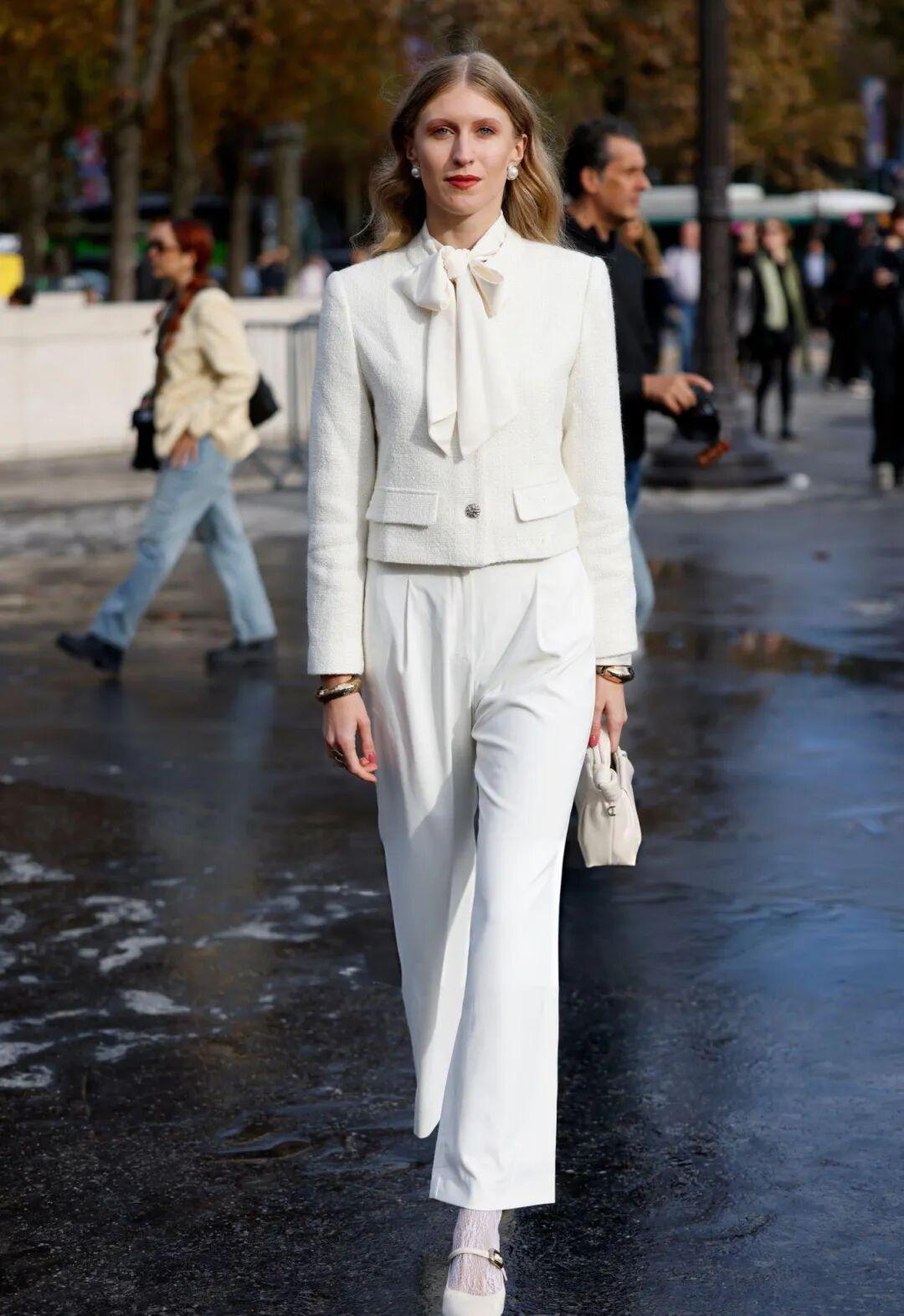 例如,用挺括面料的白裤去抵消小香风织物的细密感,使整体层次更清晰。