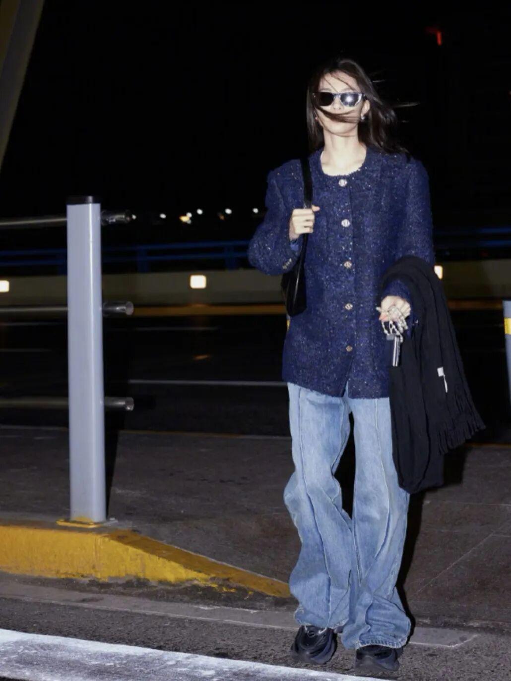 上装剪裁讲究、面料立体,而下装则用宽松的牛仔阔腿裤制造视觉的对比。裤脚长度略长、盖住鞋面,能延展腿部线条,让比例更顺。